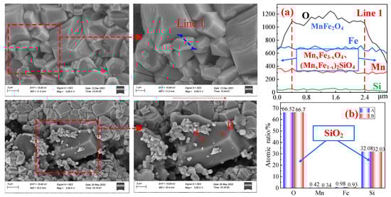 Figure 7 shows the scanning electron micrographs of the cross-sectional layers of the MnO-Fe2O3-SiO2 sample when roasted at 1100 °C for 120 min. The sample cross-section was found to have an irregular polyhedral structure and pores of different sizes, whereas there were obvious boundaries between individual particles and obvious precipitates at the edges of individual particles. Figure 7a presents the results of the line-scan energy spectrum, which shows that the content of Mn, Fe and O in the precipitates is close to 1:2:4, while the content of Si is almost nonexistent. This shows that Si cannot enter the crystal lattice of MnFe2O4 and that SiO2 does not react with the MnO-Fe2O3 system under the experimental conditions. The reason for the presence of free SiO2 in Figure 5 was further verified. The results of Figure 7b were obtained by energy spectrum scanning of points A and B. The apparent Si to O atomic ratio was approximately 1:2, which again verified that SiO2 exists in the free state and that its morphology is obviously different from that of manganese ferrite. Combined with the presence of Si in the XRD spectrum of Figure 6, it can be inferred that free SiO2 and (MnxFe1−x)2SiO4 are mainly attached to the surface layer of the product and have similar polyhedral structures. The presence of SiO2 mainly affects the microstructure of manganese ferrite compared with the SEM image of the MnO-Fe2O3 system.