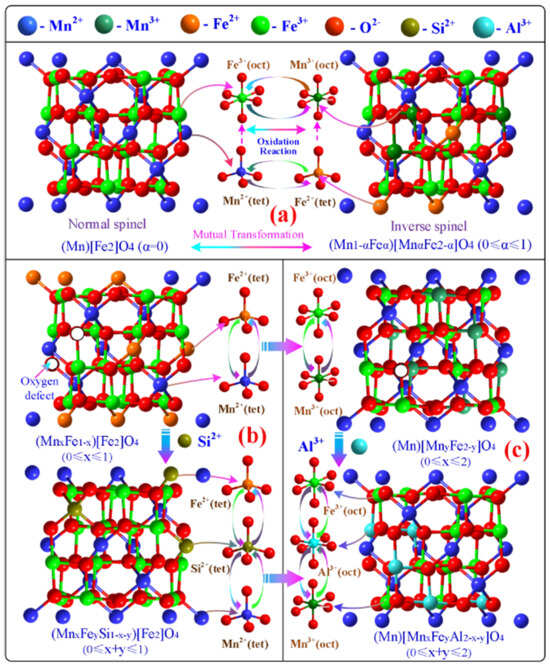 The schematic diagram for the effect of Al on synthesizing manganese ferrite MnFe2O4 is illustrated in Figure 10c. The two stages in Equations (11)–(13) were roughly divided for synthesizing manganese ferrite MnFe2O4. In the initial stages, the crystal structures of hercynite FeAl2O4 and FexMn1−xAl2O4 were similar. Some of the Fe2+ ions in hercynite FeAl2O4 are easily replaced by Mn2+ ions to form hercynite FexMn1−xAl2O4 (0 ≤ x ≤ 1) and further form MnAl2O4 after the displacement reaction. In the second stage (Equations (12)–(13)), the formation of (Mn2+)[Fe3+]2−x[Al3+]xO4 mainly originated from (Mn2+)[Fe3+]2O4, in which the octahedral Fe3+ ions and octahedral Mn3+ ions in the crystal structure of manganese ferrite MnFe2O4 were replaced by octahedral Al3+ ions to form (Mn2+)[Fe3+]2−x[Al3+]xO4 under higher oxidization roasting temperatures and the presence of Al2O3. In summary, the tetrahedral Mn2+ ions and octahedral Mn3+ ions in the crystal structure of manganese ferrite MnFe2O4 were replaced by tetrahedral Si2+ ions and octahedral Al3+ ions from (Mn2+)x(Fe2+)y(Si2+)1−x−y[Fe3+]2O4 and (Mn2+)[Fe3+]2−x[Al3+]xO4, respectively.
