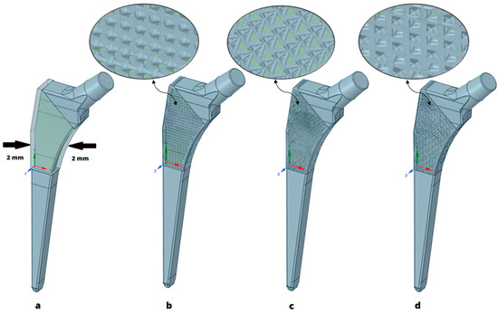 Using the design tool SpaceClaim, integrated within the ANSYS software 2021 R2 (Canonsburg, PA, USA) a hip implant was designed. Specific attention was dedicated to the stem component, where a lattice structure was ingeniously applied. The design was engineered with the purpose of enhancing the overall strength of the implant, the durability, and, most of all, the osseointegration capabilities. As shown in Figure 1: (a), a 2 mm-thick shell all over the transparent part of the implant body is to be latticed with three unit-cell types: (b) 3D-lattice infill, (c) double-pyramid lattice and face diagonals, and (d) octahedral lattice 2 (names of the unit-cell types are based on the Ansys SpaceClaim 2021 R2 Canonsburg, Pa, USA software classifications). From a medical point of view, the outer thickness of 2 mm was chosen to be latticed in order to ease the interaction between the bone and implant since the value of Young’s modulus for the implant material decreased, as proven in a previous study [39], into a value close to the bone’s, which made the integration smoother [40].