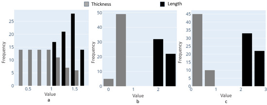 Histogram plots for data selection: (a) 3D-lattice infill, (b) double-pyramid lattice and face diagonals, (c) octahedral lattice 2.