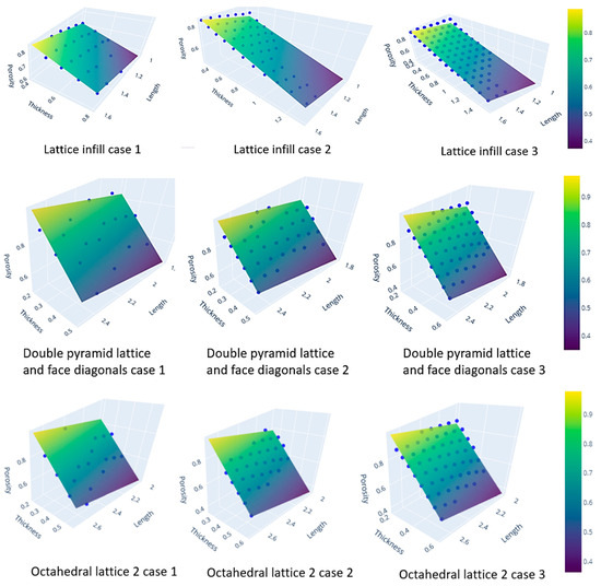 Through the careful examination of the accuracy levels, it is noticeable that precision can be attained with a relatively modest number of learning points. Specifically, 81 learning points were sufficient for the 2D lattice infill, while 54 learning points were adequate for the double-pyramid lattice and Face Diagonals. Octahedral lattice 2 demonstrated a similar efficiency, also requiring 54 learning points to yield accurate results.