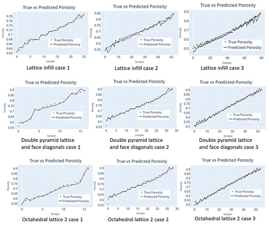 The machine learning models demonstrated a good performance across all three types of lattice structures, achieving acceptable levels of accuracy. In order to assess the accuracy, a thorough evaluation was conducted by comparing the predicted values with the actual data in the dataset. The detailed breakdown of these accuracy scores for each case is provided in Table 3.