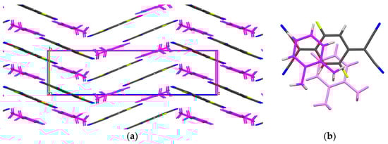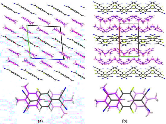 Unlike cocrystals 1 and 3, an equimolar D:A ratio is observed in cocrystals 2 and 4 obtained in the similar crystal growth conditions, but in the series of o-xylene complexes, only cocrystal 2 with F2TCNQ has a donor–acceptor ratio of 1:1 (Figure 2). A reasonable explanation might be in the comparatively strong hydrogen bonding between the acceptor molecules. This interaction between the cyano groups and hydrogen atoms results in infinite planar ribbons in cocrystal 2 (Figure 3a). The spare cyano group forms hydrogen bonds with donor molecules also located in the same plane. Such a planar hydrogen-bonded motif is preorganized for π∙∙∙π interactions with the neighbouring ribbons. In contrast, there are no hydrogen atoms in the F4TCNQ acceptor; thus, no planar supramolecular arrangement is observed, and the acceptor molecules are located at approximately 33° with respect to each other (Figure 3b). A similar arrangement is observed in cocrystal 1 due to the disorder of the fluorine atoms over four positions in F1TCNQ. Such a supramolecular arrangement promotes a 2:1 donor–acceptor ratio.