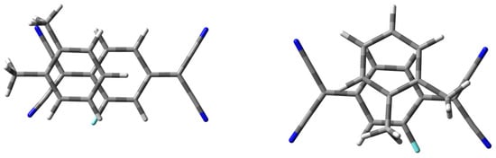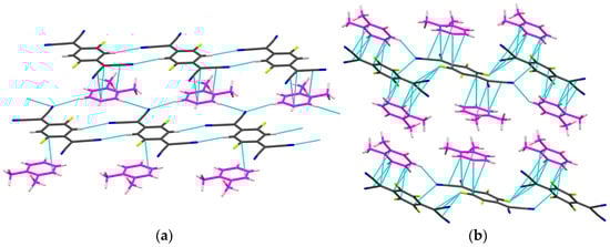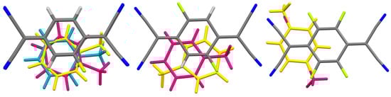 A more complicated scenario can be observed for very small donor aromatic molecules and classical TCNQ acceptors. This combination can produce ambiguous results in terms of crystal structure. The reasons for this are the very weak CT face-to-face interactions due to the small size of the donor, and multiple lateral interactions, which are possible with the participation of the acceptors. They strongly depend on the number of fluorine and hydrogen atoms in the acceptor coformer. The smallest aromatic benzene molecule does not form cocrystals with the TCNQ derivatives judging by the absence of reliable data in CSD [19]: only one entry (refcode TCNQBZ) without coordinates is present. However, benzene-containing cocrystals are numerous for three-component systems. In the majority of cases, benzene participates in C-H∙∙∙π interactions with PAH donors with a nearly orthogonal orientation of the aromatic planes [20,21,22]. The introduction of the methyl group increases the donor properties of benzene and allows a series of toluene CT cocrystals with TCNQ derivatives demonstrating weak face-to-face π-π interactions [23,24] to be obtained. The methyl substitution shows up not only in the increase in the donor properties of the aromatic molecule, but can also result in a completely different crystal packing as occurs in the complexes containing anthracene versus methylanthracene donors with TCNQ acceptors [25].