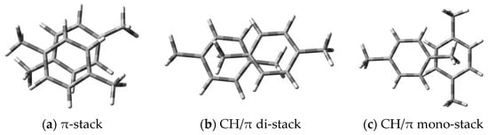 It is interesting to verify this premise using a more simple model—toluene. In view of the DFT-PBE0 approach, CH/π di-stack, CH/π mono-stack and T-shape isomers correspond to the energy minima. According to the MP2 and DFT-wB97XD methods, the π-π stack is also a stable structure, which is in good agreement with the results for xylenes. At the same time, the wB97XD functional does not produce an energy minimum for the classical T-shaped complex (Table S5). In general, it is evident that the wB97XD functional gives larger values for the interaction energy in this complex in comparison to MP2 data.