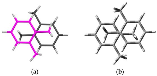 The principal difference between toluene and xylene cocrystals with the TCNQ derivatives is the 2:1 donor–acceptor ratio in two cocrystals of o-xylene versus the 1:1 ratio in cocrystals of toluene. To obtain an insight into the reasons behind this, donor–donor face-to-face interactions were analysed for three structural motifs, involving π-π stacking interactions between the rings (π-stack) (Figure 6a), CH∙∙∙π interactions with the participation of two methyl groups (CH/π di-stack) (Figure 6b) and CH∙∙∙π interactions with the participation of only one methyl group (CH/π mono-stack) (Figure 6c). These dimers are shown for p-xylenes. Two functionals give different estimates for the stability of these structural isomers (Table S4). According to PBE0 calculations, π-complexes do not correspond to an energy minimum, as is expected for this functional. CH/π mono-stack dimers are also not stable in most cases. The only stable isomer is CH/π di-stack: its stabilization energy grows in the series of para- and meta- and is maximal for ortho-xylene dimers.