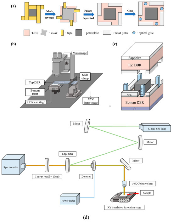 (a) Schematics of the procedure for thin film and metal pillars. (b) DBR alignment platform. (c) Schematics of the device. (d) The setup of the PL measurement.