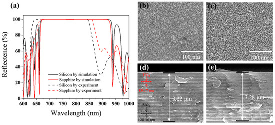 Characteristics of DBR. (a) Simulated and experimental results of DBR. (b) Surface of DBR before using UVO cleaner. (c) Surface of DBR after using UVO cleaner; the surface topography remains the same compare with (d). (d) Cross-section of DBR before using UVO cleaner. (e) Cross-section of DBR after using UVO cleaner (the slightly different thickness in (d,e) is due to the measurement deviation); the thickness is similar to (d).