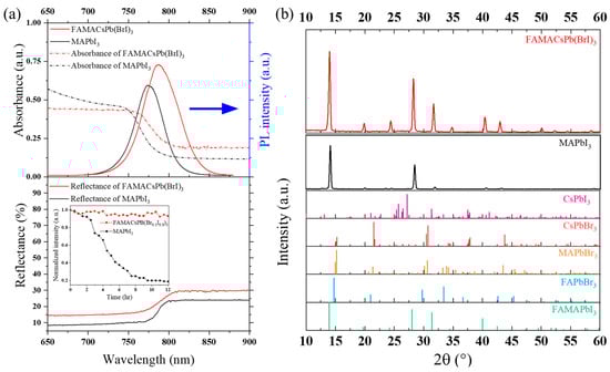 The stability test over several hours for FAMACsPb(Br0.1I0.9)3 and MAPbI3 is depicted in the lower section of Figure 3a. During the stability test, the environmental temperature was at 30 °C, with humidity at approximately 50~60%. After approximately 10 h, the intensity of the MAPbI3 decreased by 20% compared with the original sample, while the intensity of the FAMACsPb(Br0.1I0.9)3 remained consistent and could be sustained for up to one month (see Appendix A).