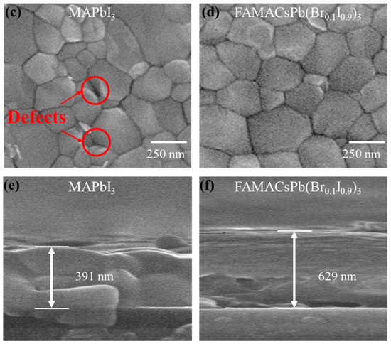 We also used an X-ray diffractometer (XRD) to confirm the successful synthesis of the triple-cation perovskite and MAPbI3, as shown in Figure 3b. The XRD results are consistent with previous studies [60,61,62,63,64,65,66]. As seen in Figure 3d,f, SEM images of the FAMACsPb(Br0.1I0.9)3 reveal consistent grain sizes, fewer defects, and a greater thickness compared with MAPbI3 (Figure 3c,e). For SEM images and cross-section images with a larger scope and statistical data on grain sizes, refer to Appendix B. A film with these properties can reduce the non-radiative recombination probability [67,68,69,70], thereby increasing the quantum efficiency (QE). Additionally, a thicker gain material can provide a higher optical gain [71,72]. Therefore, we have demonstrated that while the center wavelength of FAMACsPb(Br0.1I0.9)3 is similar to that of MAPbI3, it offers superior film quality and a broader gain spectrum. Leveraging these advantages, FAMACsPb(Br0.1I0.9)3 is a more favorable choice as a gain material when constructing a tunable laser.