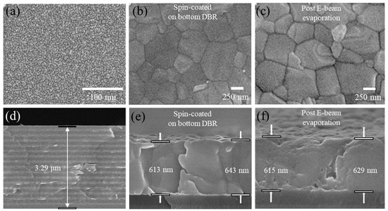 As mentioned above, silicon was employed as the substrate for the bottom DBR to prevent light penetration, and the final layer of the bottom DBR is TiO2. We spin-coated the perovskite material onto the last layer of TiO2 on the bottom DBR. This substrate differs from the one used in previous measurements of the material properties of FAMACsPb(Br0.1I0.9)3. To ensure the successful spin-coating of perovskite onto the TiO2 layer, we conducted SEM observations in both top view and cross-section to assess whether there are differences in grain size and thickness compared with when it was spin-coated onto sapphire. The initial surface and thickness of the bottom DBR is shown in Figure 4a,d. FAMACsPb(Br0.1I0.9)3 is spin-coated in the center of the DBR with an area of 1 × 1 cm2, defined by the polyimide tape. The grain size (Figure 4b) and thickness (Figure 4e) are not affected by the tape. A mask is covering it to avoid perovskite destruction. Figure 4c,f illustrate that the grain size and thickness of the perovskite remain similar, suggesting that our mask effectively shields the perovskite from any detrimental effects during the deposition process. For larger-area SEM images and grain size statistics corresponding to the material spin-coated onto the DBR (Figure 4b) and post-E-beam evaporation (Figure 4c), please refer to Appendix C.