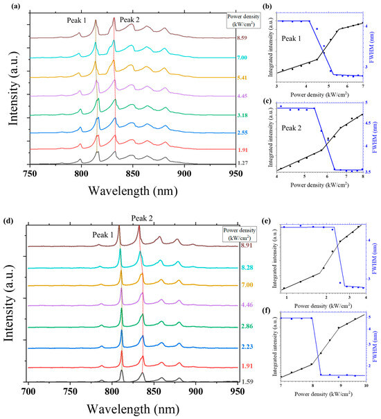 Lasing characteristics of different pressures applied on the cavity. (a) PL spectra of the weak pressure. (b,c) Integrated intensity and emission FWHM for (a) at 813.5 and 831.3 nm. (d) PL spectra of the strong pressure. (e,f) Integrated intensity and emission FWHM for Figure 4d at 811.3 and 832.2 nm.
