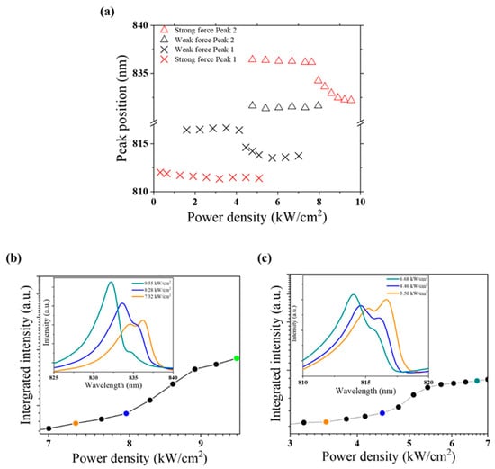 We observed a slight shift in the peak when increasing the excitation intensity. The peak shifting spectra of the two different forces are plotted in Figure 6a, which shows the peak position for different power densities. Through Figure 6a, two significant gaps appear in the strong force at peak 2 (red triangle) and weak force at peak 1 (black cross). The typical emission spectra of these peaks are depicted in Figure 6b,c. From Figure 6b (weak force peak 2/black cross), we show the emission for three power densities, below (orange) and above (blue) the lasing threshold and saturation (dark cyan). Peaks can be identified at 816 nm, 814 nm, and 813 nm, respectively. The mutual rise and fall of these peaks are due to mode competition. Mode competition occurs when the cavity can allow multiple modes to exist [82]. The modes compete with each other in terms of gain. In the main panel of Figure 6b, the ratio between the two lasing peaks is plotted versus the power density to illustrate mode competition. The orange/blue/dark cyan curve in the inset corresponds to the same experimental points in the main panel. Similarly, through Figure 6c (red triangle), we also we show the emission for three power densities, below (orange) and above (blue) the lasing threshold and saturation (dark cyan). Peaks can also be identified at 836 nm, 833 nm, and 832 nm, respectively.