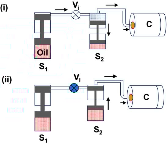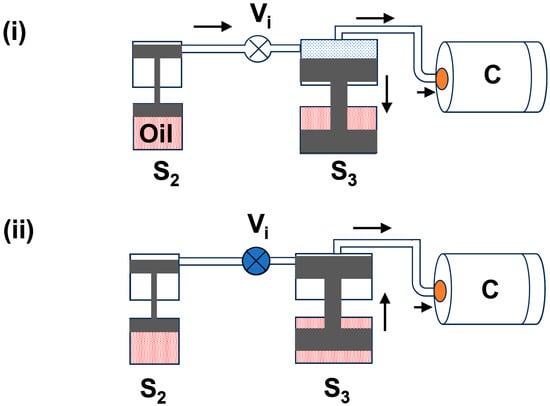 (a) First-stage piston (S1): First, the gas bottle is opened, and the gas enters through the intake valve (Vi) into all piston cavities and the high-pressure chamber. Figure 1i demonstrates the gas refilling process in the first piston cavity (S1) and chamber (C). During this process, gas is filled in the upper part of the S1 by moving the piston down to the oil tank. Basically, the piston moves down with the gas bottle pressure of ~200 bar. After 4–5 min, we close the intake valve (Vi) and move the piston in an upward direction slowly to pressurize the gas inside the chamber. Figure 1ii depicts the movement of the piston in an upward direction in the S1 cavity. Through this first stage, we can reach the maximum pressure of up to 800 bar, i.e., the gas pressure can increase from 200 bar to 800 bar.