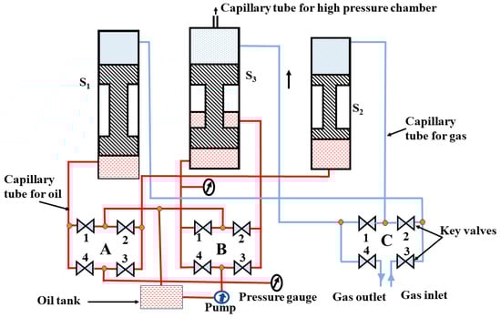 Schematic diagram of a compressor based on the oil pump with three-stage pistons. “A” and “B” represent a set of key valves to operate the oil pressure through the oil pump for various stages (S1, S2, and S3), whereas “C” depicts a set of key valves to operate the gas pressure for these three stages. The numbers 1, 2, 3, and 4 are used to represent the four key valves for the systematic operation of the compressor.