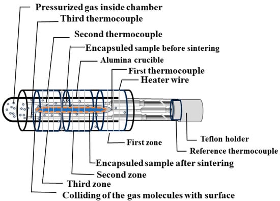 (iii) Sample holder with furnace: This component contains a wide setup, consisting of essential components like the sample container, furnace, thermocouples, and pressure gauge. A systematic block diagram is shown in Figure 7. The sample container, designed either in a boat or cylindrical form with a secure cap, acts as the vessel for keeping the samples inside the high-pressure chamber. The furnace is equipped with a Kanthal (FeCrAl alloy) heater wire capable of reaching temperatures up to 1100 °C under high pressure for a long time. When higher temperatures are needed, molybdenum (Mo) wires can be utilized, through which the maximum temperature can reach up to approximately 1700 °C within this high-pressure chamber [3], as listed in Table 2. Furthermore, either a single or multi-zone furnace can be used, as shown in Figure 7, to create the high temperature. However, a three-zone, or multi-zone, furnace is typically employed to establish temperature variations during the sample growth process. The length of the heater is around ~15 cm, and a thermal gradient in one zone furnace can be observed in the range of 10 °C to 30 °C at the top and bottom of the chamber compared to the center part of the chamber.