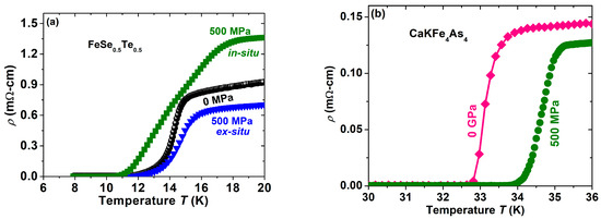 After having a good experience with this 11 family of FBS, we have started to work with CaKFe4As4 (1144) which is a stoichiometric compound of FBS [15,24]. On the basis of the optimization of the 11 (FeSe0.5Te0.5) family, we have prepared 1144 samples under the optimized conditions (500 MPa, 1 h) at 500 °C. Interestingly, CaKFe4As4 prepared by HP-HTS has enhanced the superconducting transition by ~2 K with improved sample quality compared to the 1144 bulks prepared under the conventional synthesis method [15] at ambient pressure. The resistivity measurements of these samples are depicted in Figure 8b, which clearly enhances the Tc value with a sharp transition. It suggests that the 1144 bulk prepared by HP-HTS has homogeneous and well-connected grain boundaries. In a similar way, we are also applying this HP-HTS to other members of the 1144 and 1111 families.