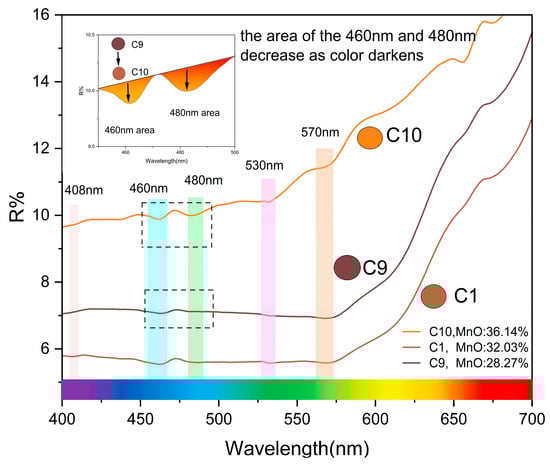 As is shown in Figure 2, the UV-visible absorption spectrum in the 400–700 nm range of spessartines appears different. The spessartine UV-visible absorption spectrum shows that there are five obvious absorption bands. The narrow absorption peaks of Mn2+ are mainly around 408 nm, 460 nm and 480 nm, which is caused by the d-d electron transition of Mn2+, and the reason why the spessartine samples appear a beautiful orange color is the blue-region absorption [37]. The absorption peak of Fe2+ is mainly around 530 nm and 570 nm, which is due to the d-d electron transition of Fe2+. Comparing C10, which has a higher content of Mn2+, with C9, which has a lower content of Mn2+, the former has more intense absorption at 460 nm and 480 nm in the blue region; therefore, the color of the former spessartine sample appears more orange. This result shows an obvious relationship between UV-visible absorption spectra and chemical composition. It can be seen that the area of 460 nm and 480 nm peaks increases as the content of Mn2+increases, and there is also an obvious correlation with the hue angle. The absorption band of Mn2+ at 460 nm and 480 nm in the UV-visible absorption spectra mainly causes the beautiful orange color of spessartines, and when the absorption area of Mn2+ becomes larger, the color of the spessartine samples changes from orange-red to light orange.