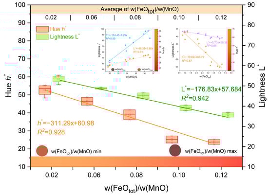 Relationship between FeOtot/MnO, FeOtot, MnO and color parameters h° and L*.