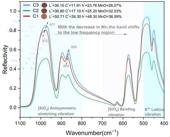 The vibration energy levels of the complex anion group, lattice (molecule) and coordination group inside the gemstone underwent transition after being irradiated by infrared light, selectively absorbing the wavelengths which correspond to the vibrational frequency and generating energy-level transitions. Mn2+ has a larger radius than other divalent ions and the vibrational frequency is smaller; therefore, with the increase in MnO content, the band frequency in the infrared spectrum shifted from the region of high frequency to low frequency. With the increase in MnO content from 28.27% to 36.59%, peak A moved from 977 nm to 972 nm. The D-peak also moved from 869 nm to 864 nm. Therefore, the content of MnO can be roughly compared by the peak A value of different spessartine samples.