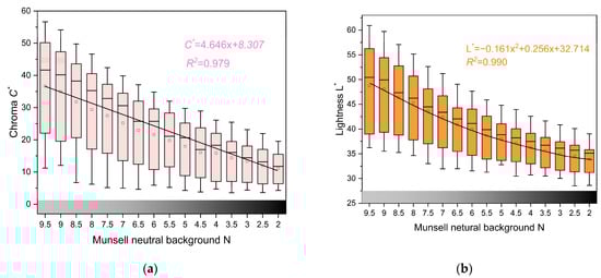(a) Chroma C* change in three samples with different color under different backgrounds. (b) lightness L* change in three samples with different color under different backgrounds.