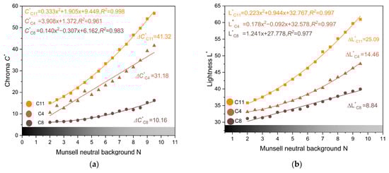 The range level of Neutral Grey Backgrounds is N0.5 to N9.5, and the color of spessartines corresponds to the lightness of the backgrounds. The spessartines with different lightness L* and chroma C* can also be affected by the Neutral Grey Backgrounds in different ways. As Figure 6 shows, we chose three spessartines, C11, C4 and C8. C11 has the highest color parameter C*, and background changes make its chroma C* the easiest to produce. As shown in Figure 6a, |∆C*|max = 41.32. C8 has the lowest lightness L* and the change in its lightness L* is the smallest, as shown in Figure 6b, |∆L*|min = 8.64.