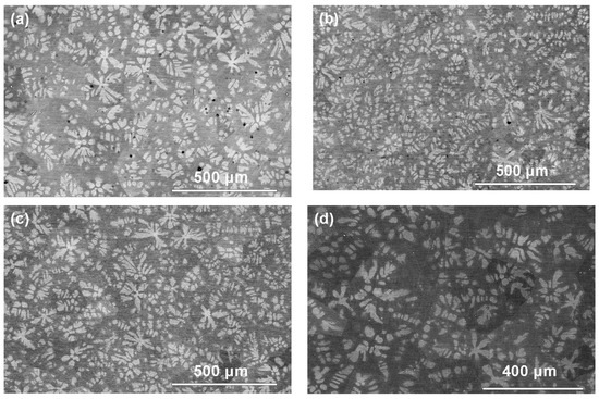 To determine the optimal annealing time for the samples, four samples were annealed at a temperature of 565 °C with annealing times of 0.5, 1, 2, and 3 h. The temperature of 565 °C was chosen based on the fact that in a similar material, namely the EZ33A alloy [3], at this temperature, the part of the structure was liquid and this temperature was approximately in the middle of the temperature range between the solidus temperature and the melting point. Therefore, we assumed that this temperature in the ZEK100 alloy should have been higher than the solidus temperature. This was confirmed by the results.
