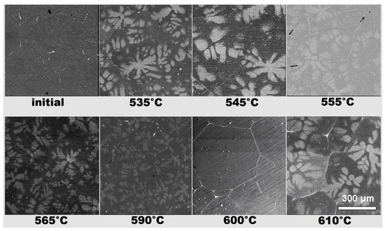 Figure 4 presents an overview set of micrographs obtained with the BSE detector. The average grain size, prior to heat treatment, was about 200 μm. It can be seen that with the increasing temperature, the structure of the alloy gradually changes. Starting from the solidus temperature of 530 °C, only small equiaxed particles of the REM-enriched phase (appears light) are observed in the Mg/Mg grain boundaries.