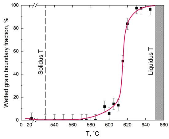 Temperature dependence of the fraction of completely wetted Mg/Mg grain boundaries (squares). Red line is the guide for the eye.