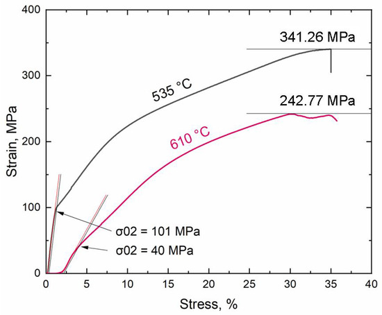 Figure 6 shows the strain–stress curves for the two samples annealed at 535 and 610 °C. The additional plots permit for calculating the yield strength parameter σ02. The compression strength for the sample annealed at 535 °C was 341.26 MPa and that of the sample annealed at 610 °C was only 242.77 MPa. The yield strength parameter σ02 for these two samples was 101 and 40 MPa, respectively.