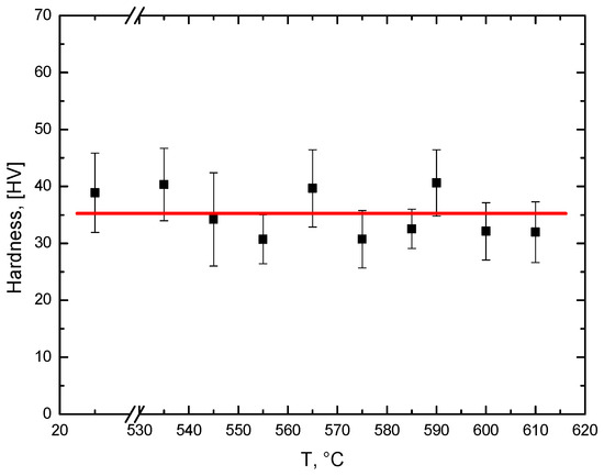 The microhardness of the Mg-based matrix (black squares) in the samples annealed between 535 and 610 °C. The point at 25 °C corresponds to the ZEK100 alloy in the as-delivered state. The red line shows the mean value of the microhardness.