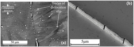 This behavior of the REM-rich grain bounadry layers can be illustrated by the SEM micrographs of the sample sections examined after the mechanical tests. Figure 8 shows the microstructure of two sections of the deformed sample. In Figure 8a, it is visible that during deformation, the dislocations slide in the bulk of the Mg grains until they reach the grain boundaries. Here, they either cross the grain boundary in a place where there are no solid particles of the intermetallic compound on it, or they stop at the particle of the intermetallic compound, accumulate, and form a pile-up. It is because, due to the higher hardness of the REM-enriched phase [3], the significantly greater forces must be applied to glide dislocations in this phase. To the right of the grain boundary (Figure 8a), the curved lines between the dark-grey and light-grey areas are visible. They can be interpreted as traces of dislocation sliding. To the left of the grain boundary in Figure 8a, there are intersecting areas of alternating contrast due to distortions in the Mg crystal lattice. In Figure 8b, it is clearly seen that in those areas where the intermetallic phase interlayers completely wet the grain boundary, the dislocations accumulate at the interphase boundary Mg/REM phase until at some point, the load on the intermetallic interlayer exceeds a certain critical value. Afterward, the crack forms in the REM-rich intermetallic compound. This fact confirms once again that the different morphology of the location of the intermetallic phase in the wetted and non-wetted grain boundaries significantly affects the mechanical properties of the alloy.