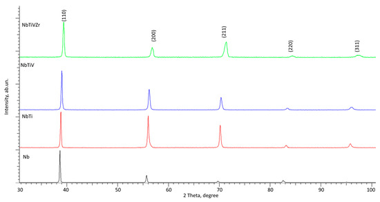 The results of X-ray diffraction of the studied alloy samples depending on the variation of components in the composition (Nb, NbTi, NbTiV, and NbTiVZr).