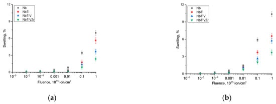 The hardening effects observed for the NbTiV and NbTiVZr alloys were due to their increased resistance to radiation-induced swelling associated with the accumulation of radiation damage (including point defects, vacancies, and primary knocked-out atoms). In this case, the hardening effects observed for these alloys, with increasing irradiation fluence (as well as with changing the type of ions during irradiation), are in good agreement with several experimental works [32,33], in which this hardening was explained by dislocation strengthening. In the case of a high dislocation density, as well as the presence of inter-boundary effects (associated with small grain sizes), the propagation of microcracks in the structure under external loads is difficult, which leads to an increase in resistance to embrittlement and destruction of strength properties. Notably, as illustrated in Figure 6, the most pronounced hardening effect was observed in the NbTiVZr alloys. These alloys possess an equiatomic distribution of elements in their structure, which contributes to an elevated resistance to embrittlement and destruction, as elaborated in the studies published by the authors of [30,31,32].