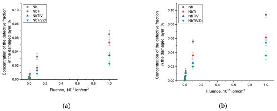 The assessment results of the defective fraction concentration in the damaged alloy layer volume under varying irradiation conditions: (a) when irradiated with Kr15+ ions, and (b) when irradiated with Xe23+ ions.