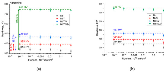 The overall trends in the alterations of hardness in the studied alloys exhibited clear dependencies on both the type of ion exposure (i.e., the type of ions) and the irradiation fluence. Furthermore, it is crucial to consider the alloy’s composition when analyzing the changes in hardness. Evaluations of hardness modifications associated with varying components revealed the following: the addition of titanium to an alloy resulted in a 14.8% increase in hardness, introducing vanadium to a two-component alloy led to a 35.7% hardness increase, and in the case of the NbTiVZr alloy, there was a remarkable hardness increase of over 116% when compared to the Nb alloy. Moreover, these changes in hardness for the initial samples have a good correlation with the data on changes in the dislocation density, which indicates the formation of the so-called effect of dislocation hardening of alloys, with variations in the number of components in them.