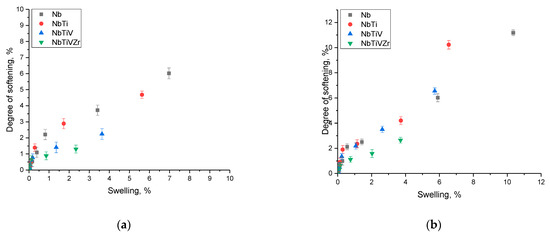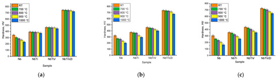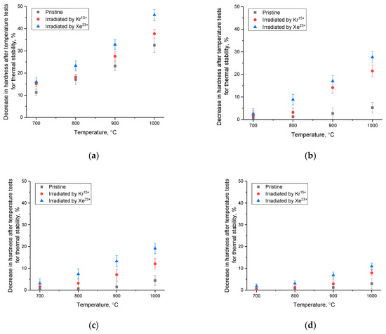As shown in the presented data, the Nb alloys, both in the original and irradiated states, proved to be the least resistant to high-temperature degradation. At the same time, the destructive changes in hardness for these alloys was primarily due to the low thermal stability of niobium, which can lead to its oxidation through the formation of an oxide layer on the surface, the thickness of which directly depends on the time and temperature of thermal exposure [34,35,36]. Moreover, in the case of the irradiated samples, the decrease in their hardness was about 30–50% at temperatures of 900–1000 °C, which indicates the low stability of the irradiated samples to high-temperature degradation, as well as its acceleration due to accumulated structural distortions in the damaged layer. In this case, as shown in the study published by the authors of [37], accelerated degradation can be caused via the formation of oxide layers on the surface, which, in the case of a near-surface layer damaged by irradiation, can contribute to its accelerated degradation and peeling, which leads towards a sharp deterioration in hardness.