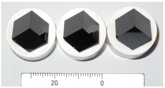 LSTO crystal (0.1% La—left, 1% La—middle, and 5% La—right) with perfect cubic shape of volume 1 cm3 used for density determination (the surfaces of the cubes belong to the {100} family).
