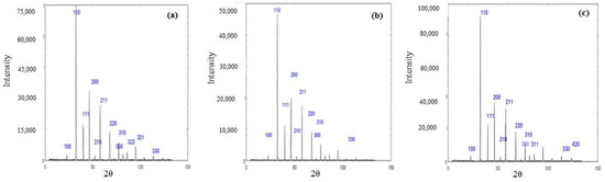 X-ray patterns of powdered LSTO with: (a) 0.1% doping of La; (b) 1% doping of La; (c) 5% doping of La.