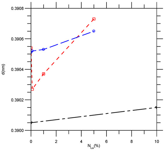 The present finding of the LSTO lattice parameters dependence on La doping level stands in contrast to the X-ray measurements reported by Kobayashi, Ikuhara et al. [12] (blue curve in Figure 3). They observed a monotonic lattice expansion as the level of La doping in the STO matrix increased, and they explained this using the electronic compensation mechanism. On the contrary, similar to our 0.1% La-doped STO crystal, Moos et al. [4,5,6] observed a reduction in lattice constants for La-doped STO ceramics and explained it using a mechanism specifically in terms of “vacancy compensation”.