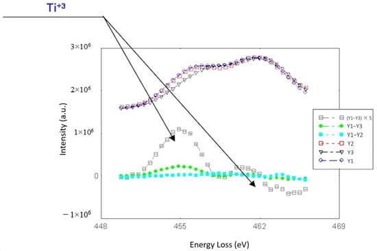 A set of three EELS spectra of the Ti L2,3 line measured for position marked in Figure 4. The relative difference between the spectra (related to the existence of Ti with valence of 3+) is shown at the bottom of the graphs for LSTO-5%La.