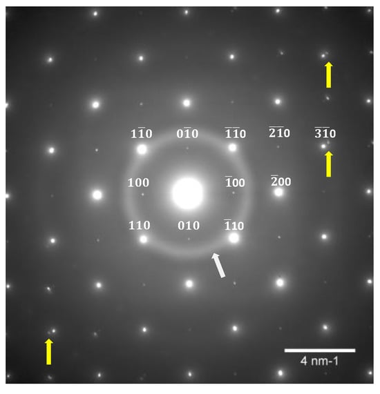 Selected area electron diffraction pattern (SAD) showing a typical distribution of reflections for a primitive structure (the image was obtained for area No. 1 marked in Figure 4) for the LSTO-5%La sample. (camera length 135 cm, HV 200 kV). The arrows mark the additional elements of the patterns that do not correspond to the regular structure: the white arrow indicates the doubling of the elementary cell; the yellow one marks an amorphous ring; and the white one indicates the distortion and local change in the lattice parameters.