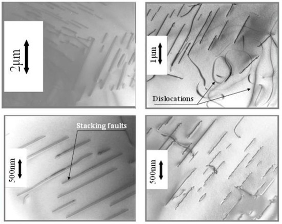 This observation is confirmed by high-resolution TEM measurements (see Figure 7). In fact, different kinds of linear and planar defects, such as dislocations and stacking faults, can be identified in TEM photography. These results align with the previously analyzed modifications of the lattice parameter and the unusual change in the real density of the crystal for a high doping level of La.