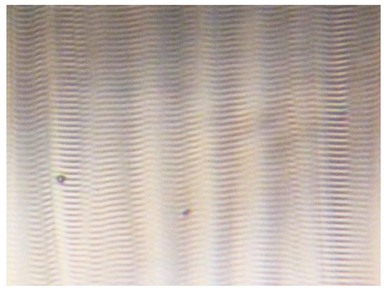 We have reported that for the high doping level of Nb in a STO crystal, the optical inspection of the thin crystal shows spatial modulation of the local transparency due to the inhomogeneous distribution of dopants [18]. It should be noted that Nb-doped crystals with reasonable homogeneous optical quality can rarely be found. We have obtained similar optical characterizations of La-doped crystals. Unfortunately, the thin crystal with 5% La (0.1 mm) had too low transparency; therefore, we investigated the thin STO crystals with 1% La doping (see Figure 8). Our optical examination revealed a band modulation of local transparency similar to that found in the uneven distribution of La using the SIMS analysis. Since inhomogeneous doping can affect the local mechanical properties, we tried to test the morphology of the crystal cleavage (parallel to the (001) plane). In contrast to the conical shape of the cleavage plane of undoped STO [19] in the case of 5%-doped La crystal, banded ordering of the micro-facets can be observed on such a prepared surface by AFM (see Figure 9a–e).