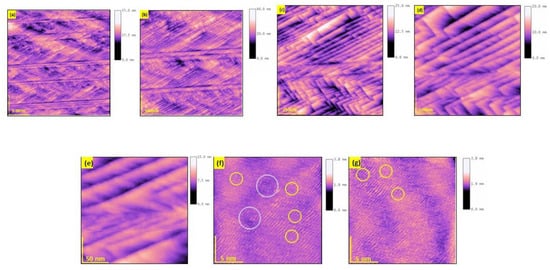 AFM topography (tapping mode) of the fractured surface (cleavage was obtained orthogonal to surface (001)) of 5%-doped LSTO shows a complicated stripe-like morphology (a–e). The micro-facets are arranged parallel to the [210] direction or create rows along [100]. The magnifications with atomic resolution (f,g) show a high concentration of dislocations (the exits were marked via yellow circles) and regions with chaotic arrangement of atoms (gray circle). The step height varies from 2–7 nm.