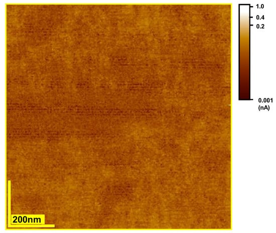 LCAFM mapping of the electrical conductivity (in-plane) of the epi-polished surface of 5%-doped STO (100) crystal. The polarization voltage of the tip was −3 V. The contamination of the crystal surface, generated by polishing, was removed in an ultrasonic cleaner.