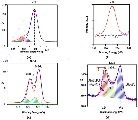 The chemistry of the contaminated surface layer leads to the formation of a sublayer with dielectric properties. As a result of leaching, the electronic structure of the crystal’s outermost monolayer may undergo modifications, causing the occupied state at the Fermi level, introduced into the system by La doping, to vanish (refer to the VB band gap with LSTO [2,21,22,23,24,25,26] as depicted in the blue curve in Figure 11). Therefore, one should remove this contaminated layer to determine the correlation of La distribution with the local electrical conductivity of LSTO using LCAFM. Scraping it off the crystal surface under ultra-high vacuum (UHV) conditions is a simple possibility. The effectivity of this preparation step can be derived from the XPS spectra (Figure 11; see the red spectra). Namely, in the O1s, any additional compounds typical for the chemical and physical sorbates exist. The disappearance of the C1s line from XPS spectra proves the surface is clean. This preparation step “revealed” the metallic properties of the LSTO surface crystal. Namely, the electronic states can be identified at the Fermi level near the bottom of the conduction band (see the blue spectrum of the VB regions in Figure 11).
