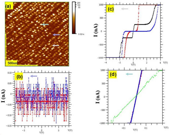 (a) LCAFM mapping of the cleaved surface of 5% LSTO (fractured surface was obtained orthogonal to the (001) original surface). The polarization voltage of the cantilever tip (PPP-contPt-W, Nanosensors) was 50 mV. Examples of the different I/V characteristics determined on non-conducting areas of the surface are presented in (b). For the conducting regions of the surface, two types of characteristic non-linear (c) and linear (d) were observed.
