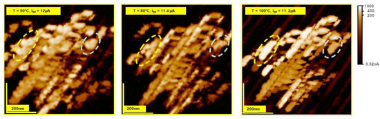 Thermal dependence of the electrical conductivity (represented by the total/integrated current) of the region with enhanced conductivity of the fractured surface; LCAFM mapping was performed for crystals annealed at temperatures of 50, 80, and 100 °C. The measured global current (integrated over the whole conductivity map) decreased with increasing annealing temperature Moreover, the electrical conductivity of some regions exhibited metallic behavior (marked by yellow line) or semiconducting dependence (depicted by the grey line).