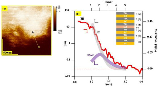 (a) LCAFM mapping with atomic resolution of the interface between regions with enhancement electrical conductivity and parts of surface without measurable conductivity (fractured surface of 5% La: STO, polarization voltage was only 1 mV). The decay of the electrical conductivity along the AB cross-line (b) shows an analogy to the reduction of the occupation of the orbitals (here, a schematic presentation adapted from [27]) calculated for the Ti layer (of STO) as a function of distance from the LaO plane. The reference mentioned above presents the exact DFT data for such a layered system [27].